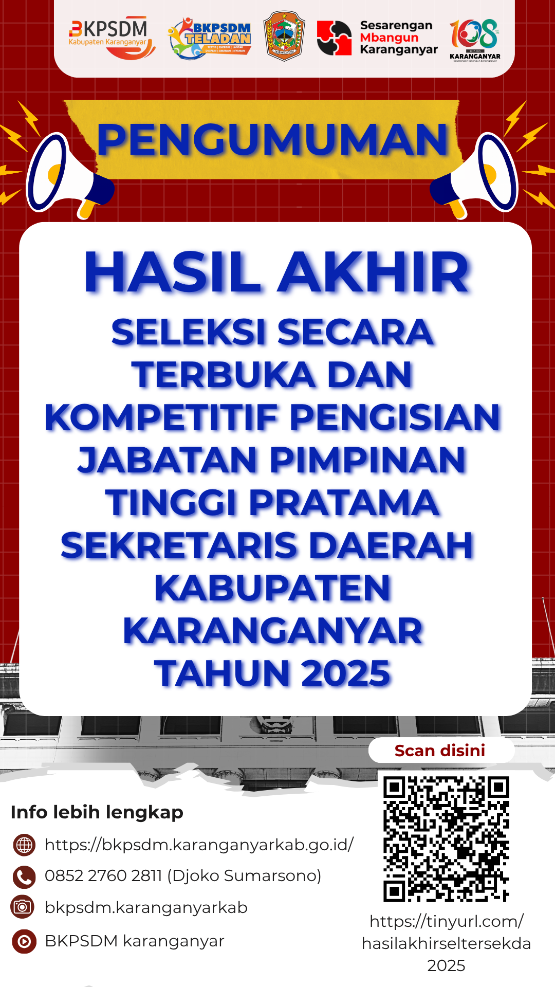 Pengumuman Hasil Akhir Seleksi Terbuka dan Kompetitif Pengisian Jabatan Pimpinan Tinggi Pratama Sekretaris Daerah Kabupaten Karanganyar Tahun 2025 Pengumuman Hasil Akhir Seleksi Terbuka dan Kompetitif Pengisian Jabatan Pimpinan Tinggi Pratama Sekretaris Daerah Kabupaten Karanganyar Tahun 2025 Klik Disini