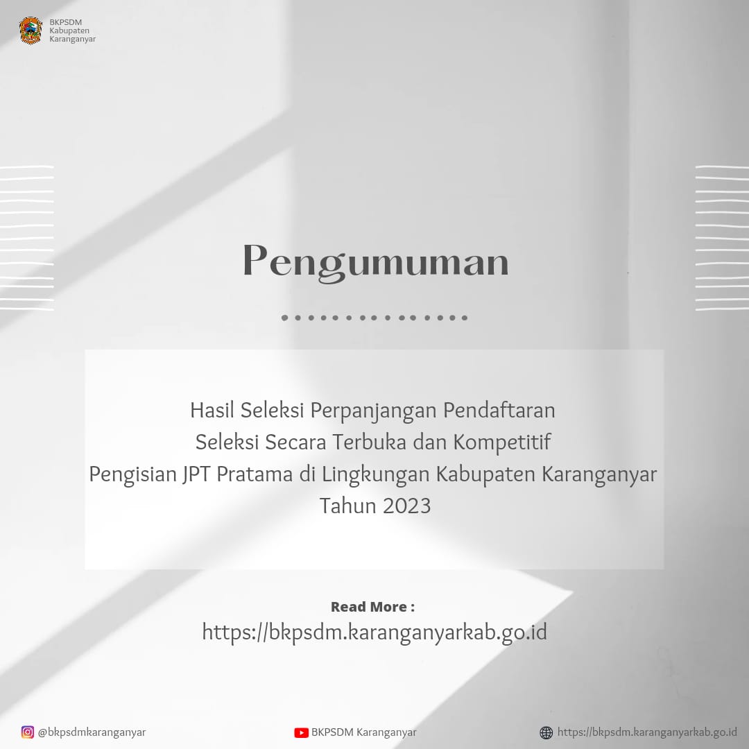 Pengumuman Hasil Seleksi Administrasi Perpanjangan Pendaftaran Seleksi Terbuka dan Kompetitif Pengisian JPTP di Lingkungan Kabupaten Karanganyar Tahun 2023
