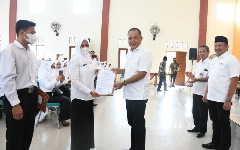 Karanganyar – Sebanyak 1.263 Pegawai Pemerintah dengan Perjanjian Kerja (PPPK) Guru di Kabupaten Karanganyar menerima Surat Keputusan (SK) Bupati tentang pengangkatan PPPK Guru Formasi Tahun 2021. Bupati Karanganyar, Juliyatmono didampingi Wakil Bupati Karanganyar, Rober Christanto, Sekretaris Daerah serta beberapa Kepala Perangkat Daerah terkait menyerahkan secara langsung Surat Keputusan tersebut di Graha PGRI, Desa Ngijo, Tasikmadu pada hari Rabu (18/05).
