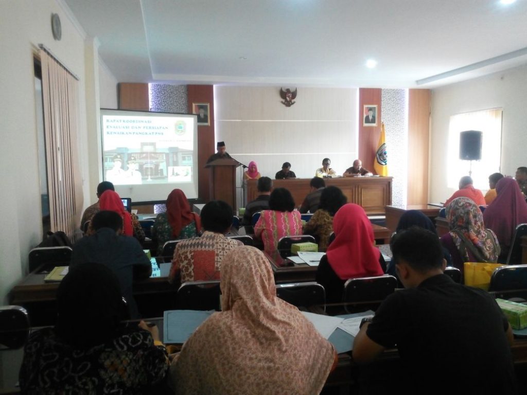BKPSDM Kabupaten Karanganyar pada hari Jumat, 8 Desember 2017 melaksanakan Rapat Koordinasi Evaluasi dan Persiapan Kenaikan Pangkat di Aula BKPSDM. Rakor ini dihadiri oleh Kasubag Umum dan Kepegawaian OPD se-Kabupaten Karanganyar dan dibuka oleh Sekretaris Daerah, Drs. Samsi, M.Si.