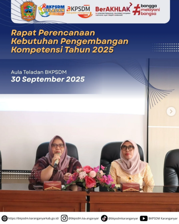 β¨ Hari Selasa, 30 September 2025 di Aula Teladan BKPSDM Kabupaten Karanganyar dilaksanakan Rapat Perencanaan Pengembangan Kompetensi, ASN Corporate University, serta Sosialisasi SOP Penyelenggaraan Pengembangan Kompetensi Perangkat Daerah.