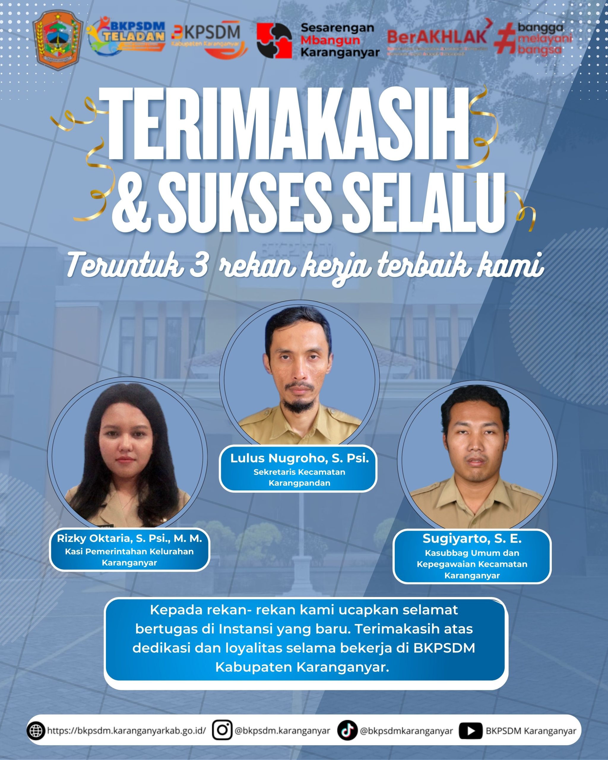 Dengan penuh rasa hormat dan apresiasi, kami mengucapkan selamat bertugas di instansi yang baru kepada Lulus Nugroho, S.Psi. (Sekretaris Kecamatan Karangpandan), Rizky Oktaria, S.Psi., M.M. (Kasi Pemerintahan Kelurahan Karanganyar), dan Sugiyarto, S.E. (Kasubbag Umum dan Kepegawaian Kecamatan Karanganyar). Terima kasih yang sebesar-besarnya atas dedikasi, loyalitas, serta kontribusi yang telah diberikan selama mengabdi dan menjadi bagian dari BKPSDM Kabupaten Karanganyar. Semoga pengalaman dan pengabdian yang telah dijalani dapat menjadi bekal berharga dalam melanjutkan amanah di tempat tugas yang baru, serta senantiasa diberikan kelancaran, kesuksesan, dan keberkahan dalam setiap langkah pengabdian.