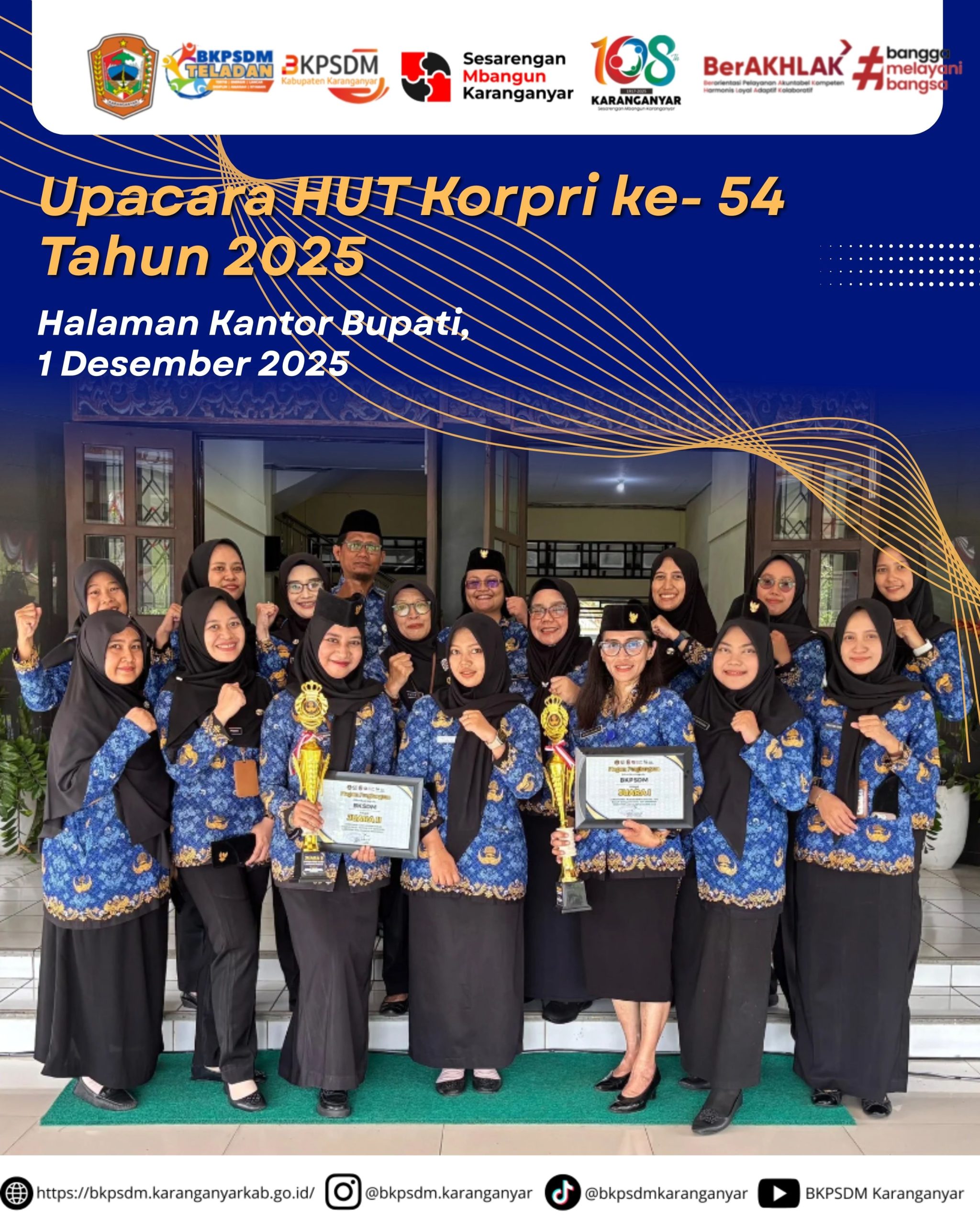 BKPSDM Kabupaten Karanganyar turut berpartisipasi dalam Upacara Peringatan Hari Ulang Tahun ke-54 Korps Pegawai Republik Indonesia (Korpri) Tahun 2025 yang diselenggarakan di halaman Kantor Bupati Karanganyar. Kegiatan ini menjadi momentum penting untuk meneguhkan komitmen seluruh ASN dalam meningkatkan profesionalisme, integritas, serta kualitas pelayanan publik.